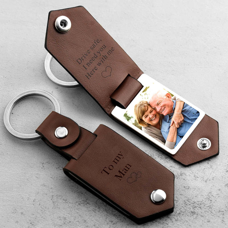 Drive Safe Keychain to My Lover to My Man Custom Leather Photo Text Keychain with Engraved Text for Him
